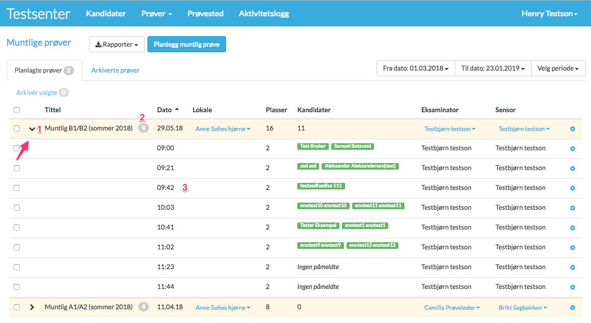 3. Viser gruppene på denne kommisjonen, med visning av klokkeslett. På samme linje ser man også hvilke kandidater som er lagt til disse gruppene. For å få se alle gruppene kan du klikke på den lille haken markert med pil.