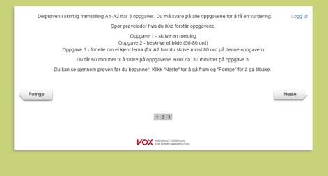 Før kandidatene begynner på delprøven i skriftlig framstilling, kommer det et skjermbilde med informasjon til kandidatene om: