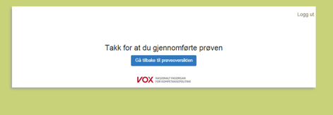 Den skriftlige norskprøven er nå fullført og kandidatene kan fylle ut et persondataskjema eller logge ut av systemet for å avslutte prøven.