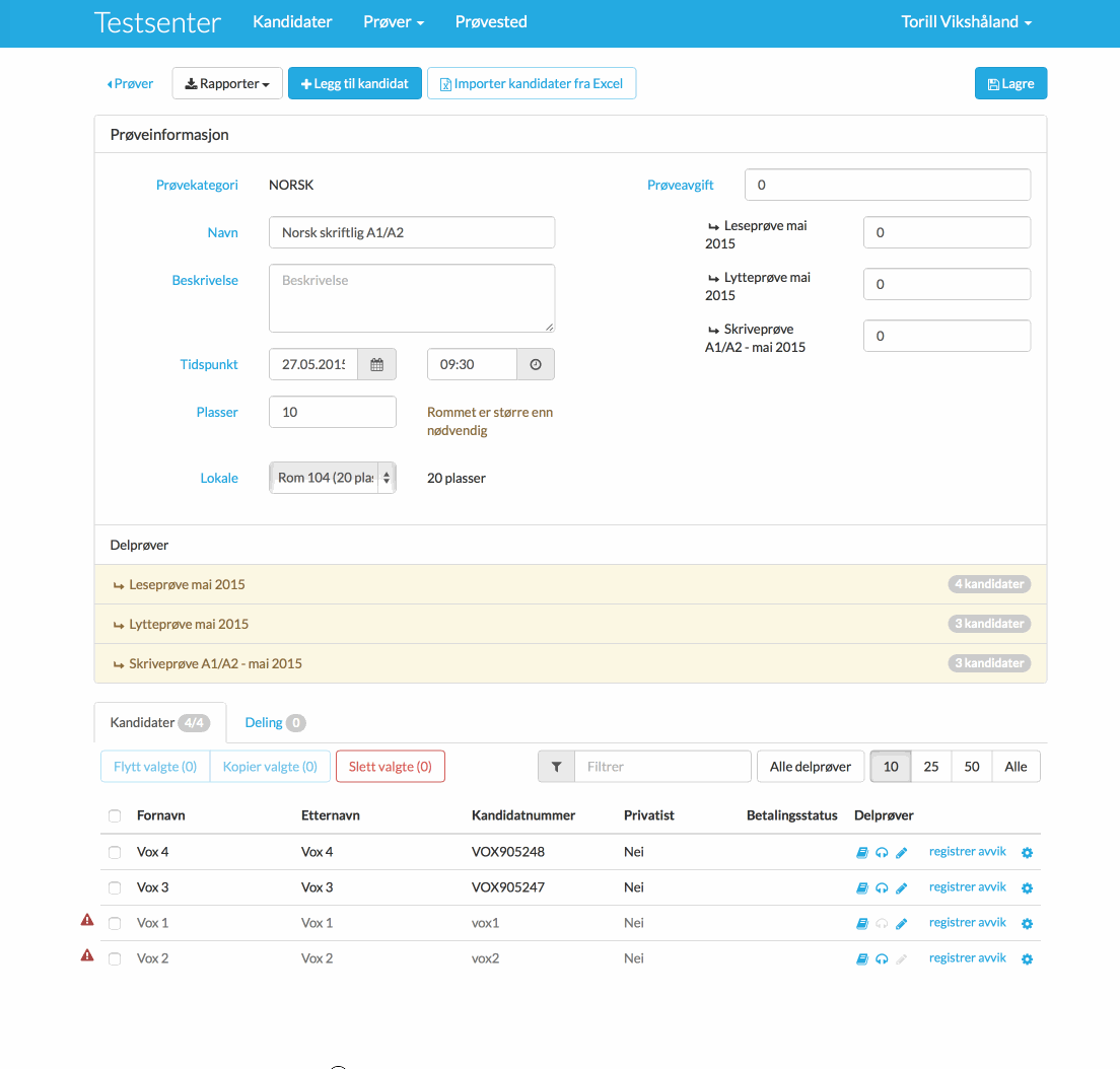 Når man legger til kandidater til en prøve, får man opp et varsel som viser at kandidaten du ønsker å legge til er deaktivert. Da er det bare å klikke på knappen Aktivér. Når kandidaten er aktivert, står det Meld opp på samme knapp. Du har altså først aktivert kandidaten og deretter meldt kandidaten opp til prøve.