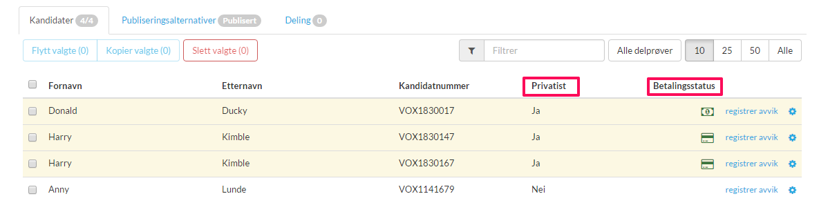 Privatister som melder seg på en påmeldingsliste via privatistportalen vises som privatister og med en betalingsstatus i PAD.