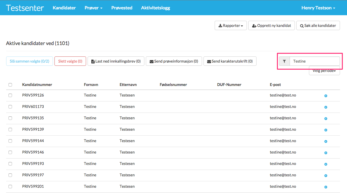 Gå til fanen Kandidater. Søk opp den kandidaten du vet har flere kandidatnumre.