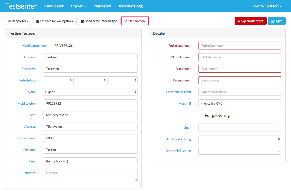 Kandidater som har tatt prøver på flere kandidatnumre, må slås sammen for å få alle resultatene på ett prøvebevis. Du kan slå sammen kandidater fra Kandidatlisten eller i Kandidathistorikken.